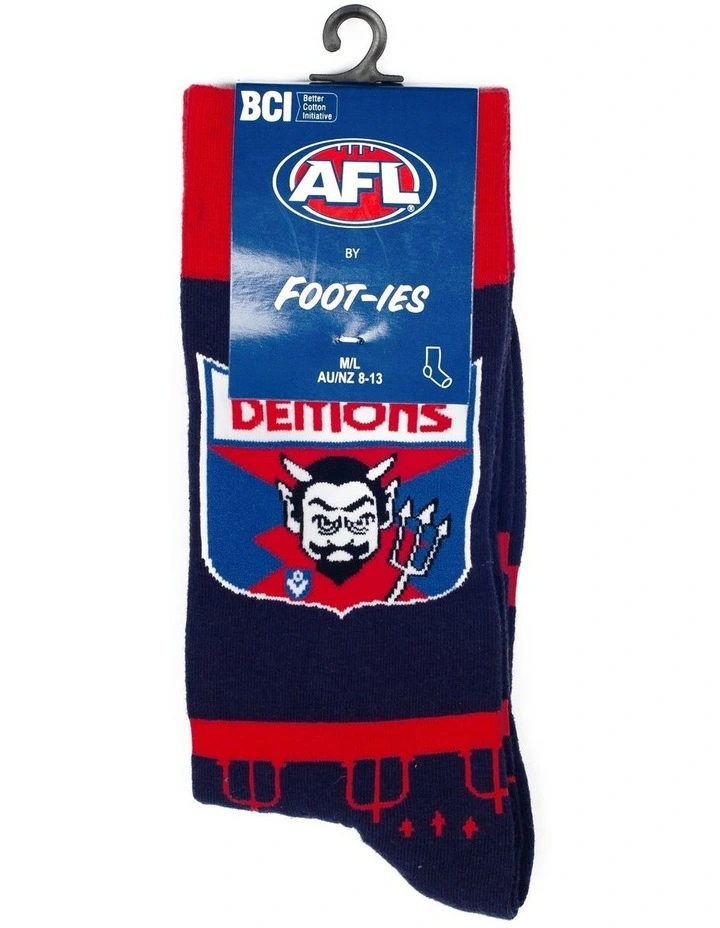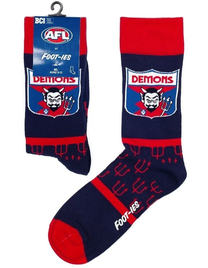 Show your Melbourne Demons team colours in these officially licensed AFL x Foot-ies socks. Foot-ies use a premium blend of cotton, polyamide and elastane fabrication with a market leading 200 needle construction. This ensures they maintain their comfort, fit and colour and also allows for detailed graphics of your favourite team! This sock is a mid rise crew sock with comfort heal gusset to ensure the perfect fit. Australian owned and designed in Melbourne. Warm machine wash for best results to keep your AFL team colours vibrant!