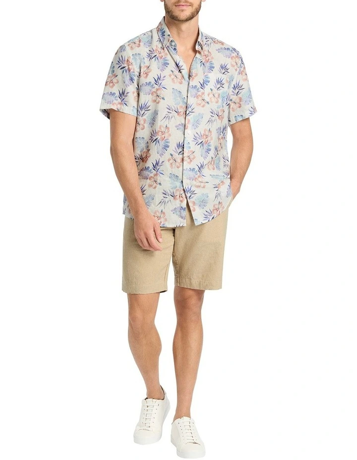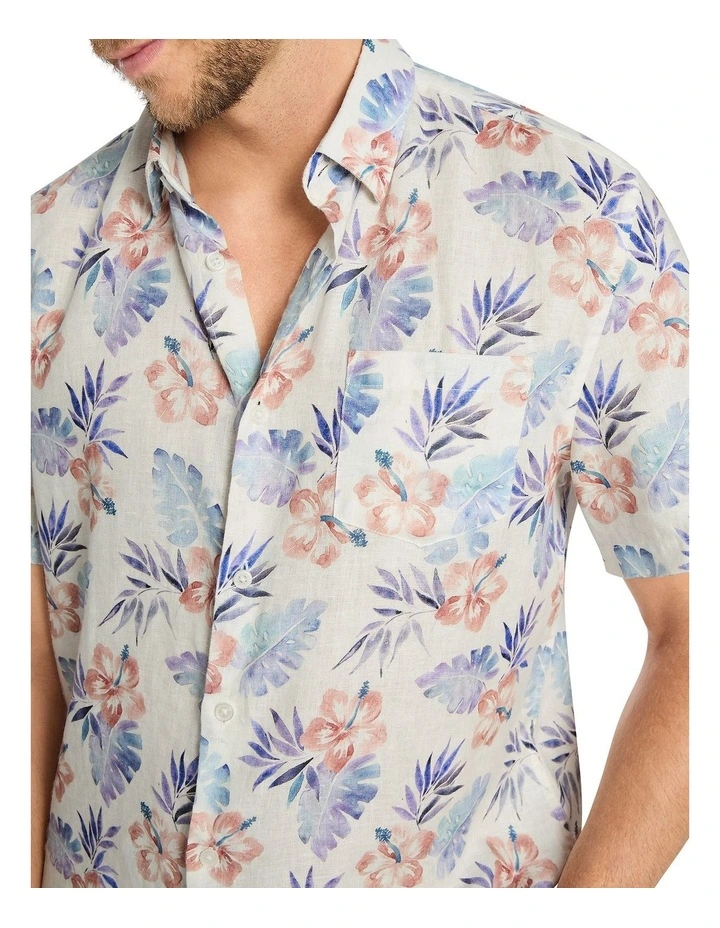 Flaunting a gorgeous floral watercolour print, this pure linen shirt sets shades of pink and blue against effortless ecru. Delivering beautiful wearability within a neat short sleeve design, the shirt fastens at the front to create a relaxed silhouette, finished with curved shaping at the hem, a single patch pocket at the chest, and a sharp shirt collar up top.