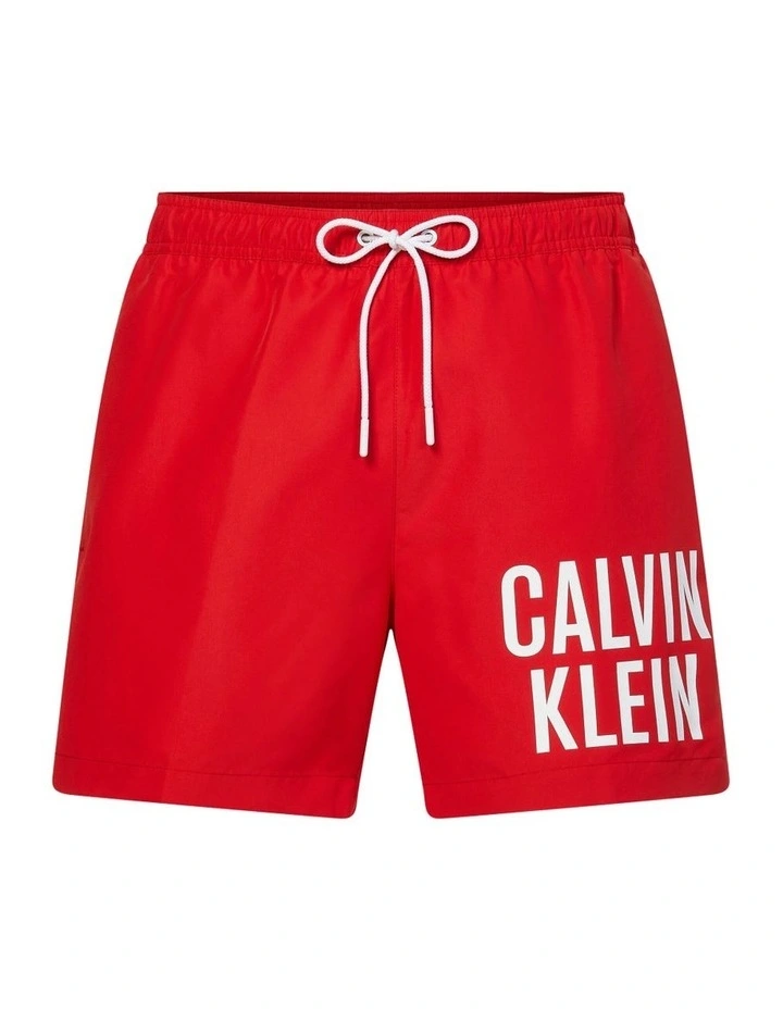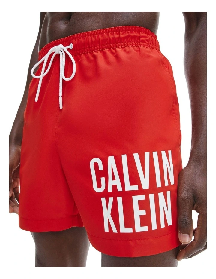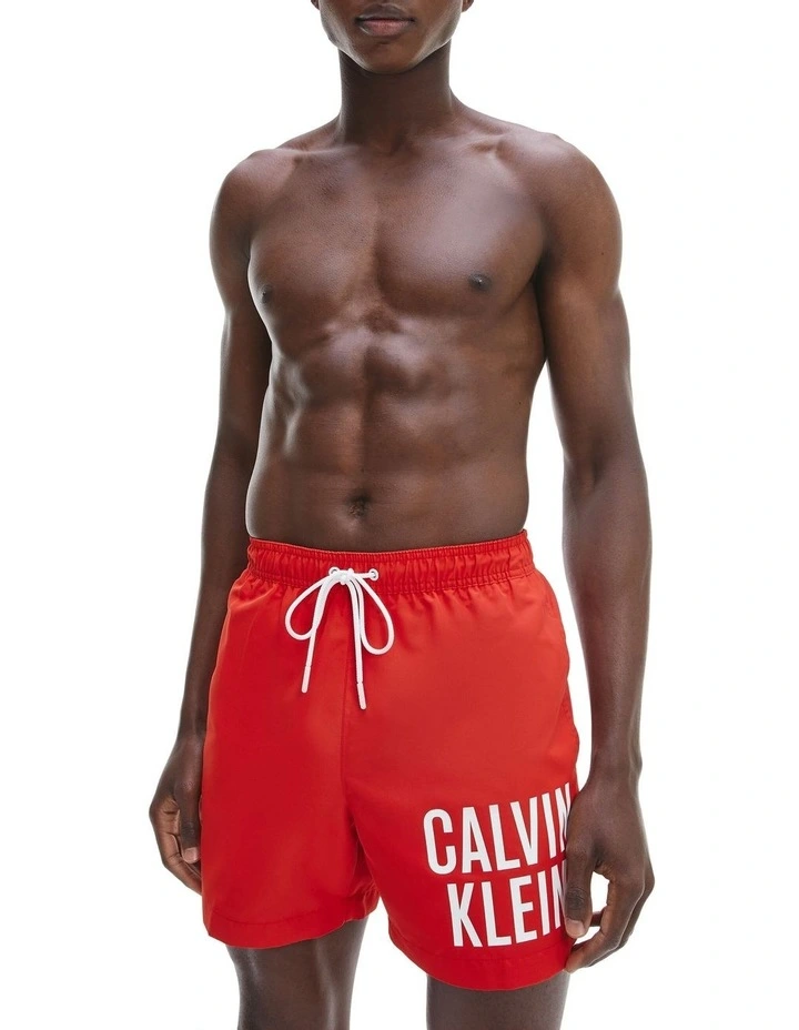 Medium length swim shorts crafted from recycled materials. These shorts feature an elastic drawstring waist, multiple pockets and CK logo print on the leg.