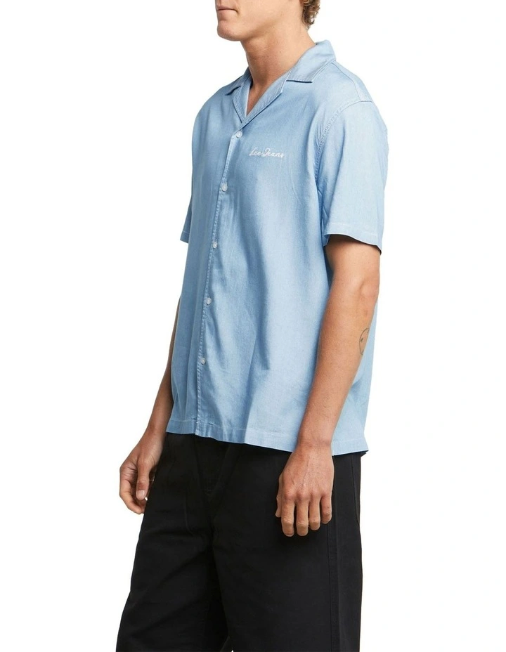 The Lee Chain Stitch Shirt in Light Indigo is a relaxed boxy fit, short sleeve shirt, with a resort style collar and traditional Chain Stitch Embroidery. Made in a light Tencel Chambray with a soft hand feel, wear this shirt open with a tee underneath casually to pub or buttoned up for a dressier look.