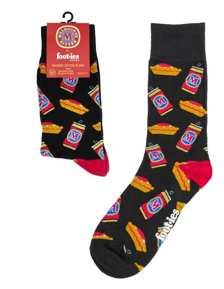 Officially licensed by CUB, these Foot-ies X Melbourne Bitter Novlety socks use a premium blend of organic cotton, polyamide and elastane fabrication with a market leading 200 needle construction. Finer, more durable and luxuriously comfortable. These socks are a crew fit with comfort heal gusset to ensure they stay in place. Australian owned and designed warm machine wash for best results to keep your Melbourne Bitter colours vibrant!