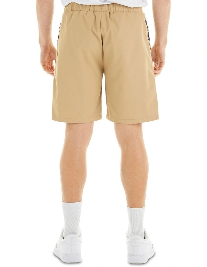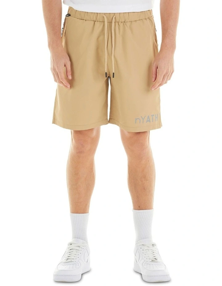 The nYATH by Nana Judy Ath Zip Woven Short, designed in a soft woven Beige fabrication with elastic waistband and drawcord. The Ath short features dual front pockets with a contrast waterproof zipper feature at the side and logo print to the hem.Â